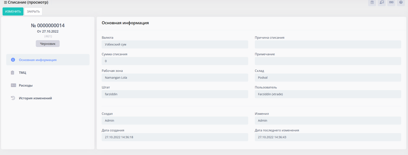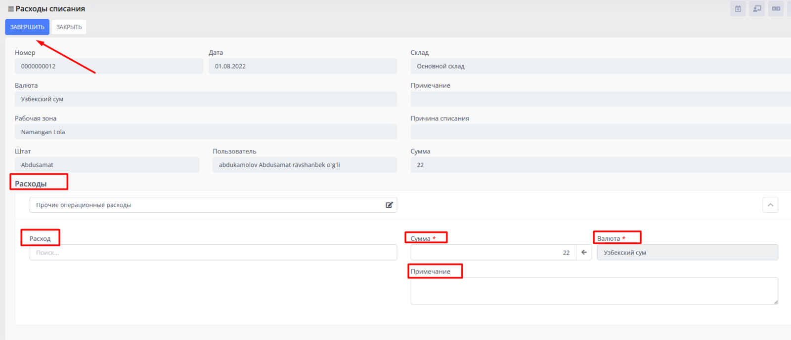 После нажатия на эту кнопку вы перейдете в документ "Расходы списания", в котором вам нужно добавить счет для расходов, тип расхода (опционально), сумму и валюту расхода, примечание (опционально). Верхние поля таблицы подтянутся автоматически. После внесения данных нажимаем на кнопку Завершить. После этого документ перейдет в статус "Завершено".