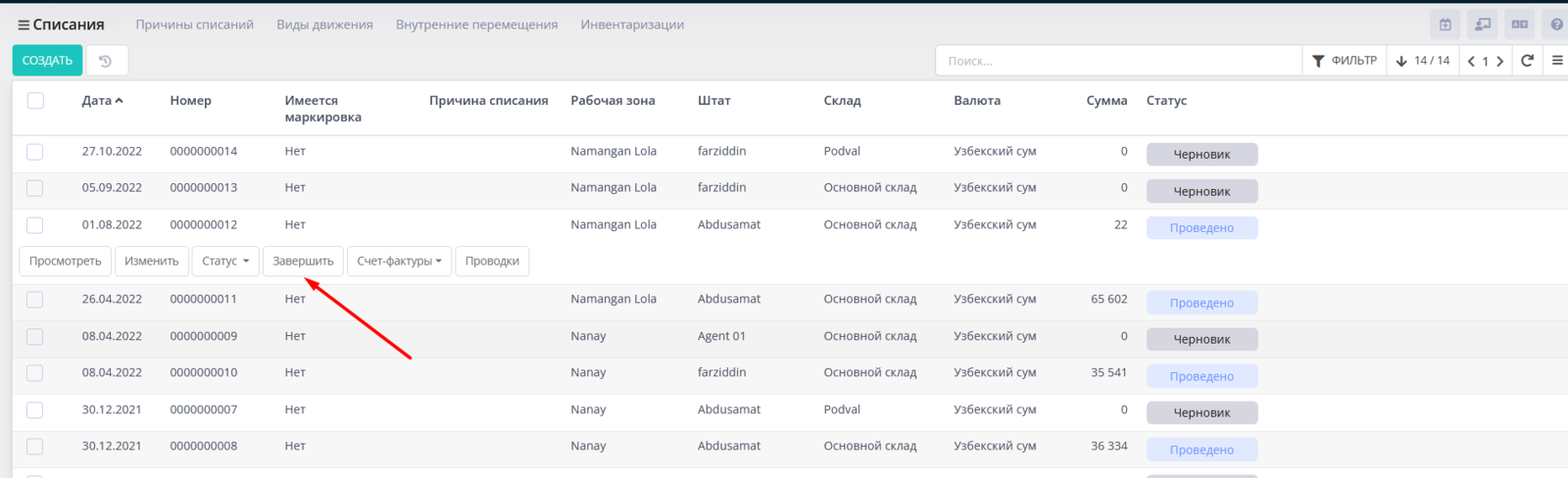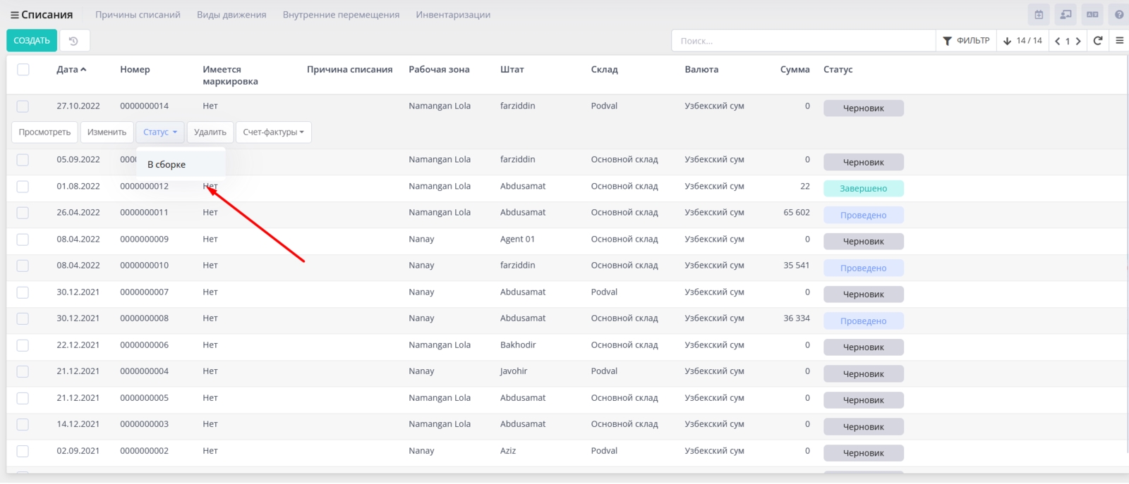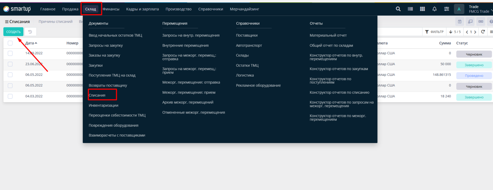 Переходим в раздел Склад - Списания и нажимаем на кнопку Создать.