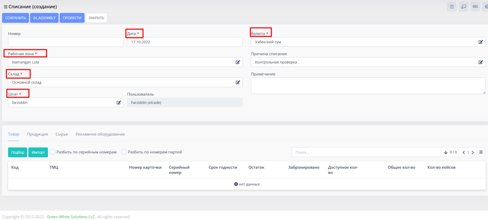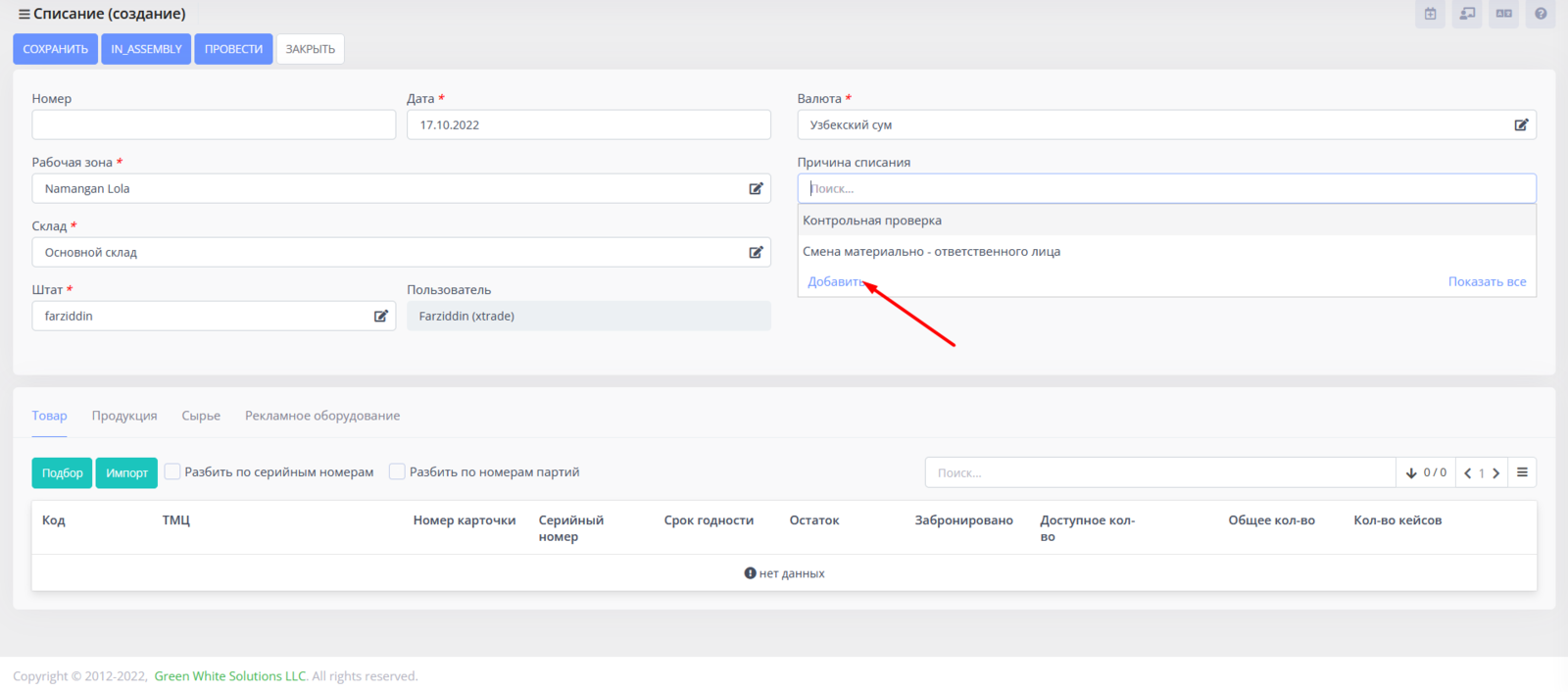 Добавляем ТМЦ для списания путем подбора или импорта