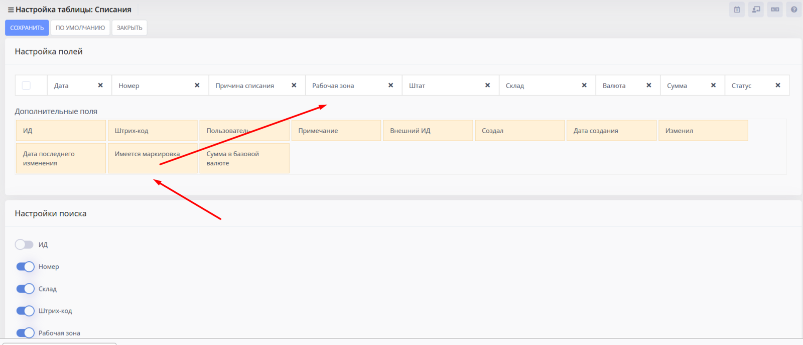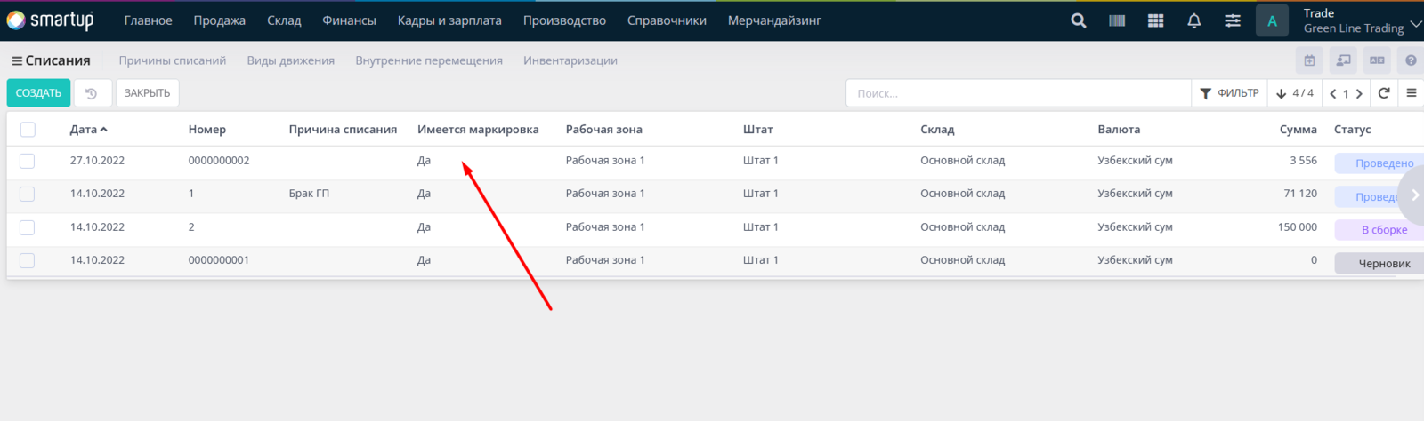 Важный момент: Вы можете сформировать список документов таким образом, чтобы видеть, в каких документах присутствует маркировка, а в каких — не присутствует, а также просматривать коды маркировки списанных товаров. Чтобы видеть эти данные, достаточно в настройках таблицы добавить столбец "Имеется маркировка".