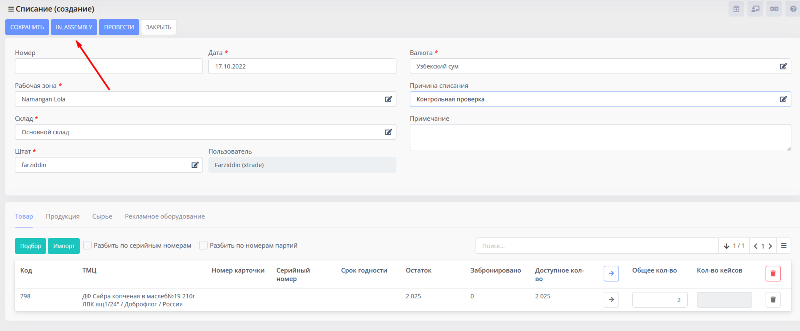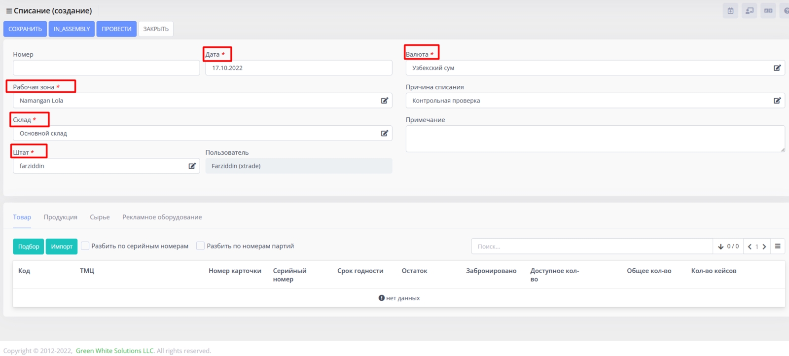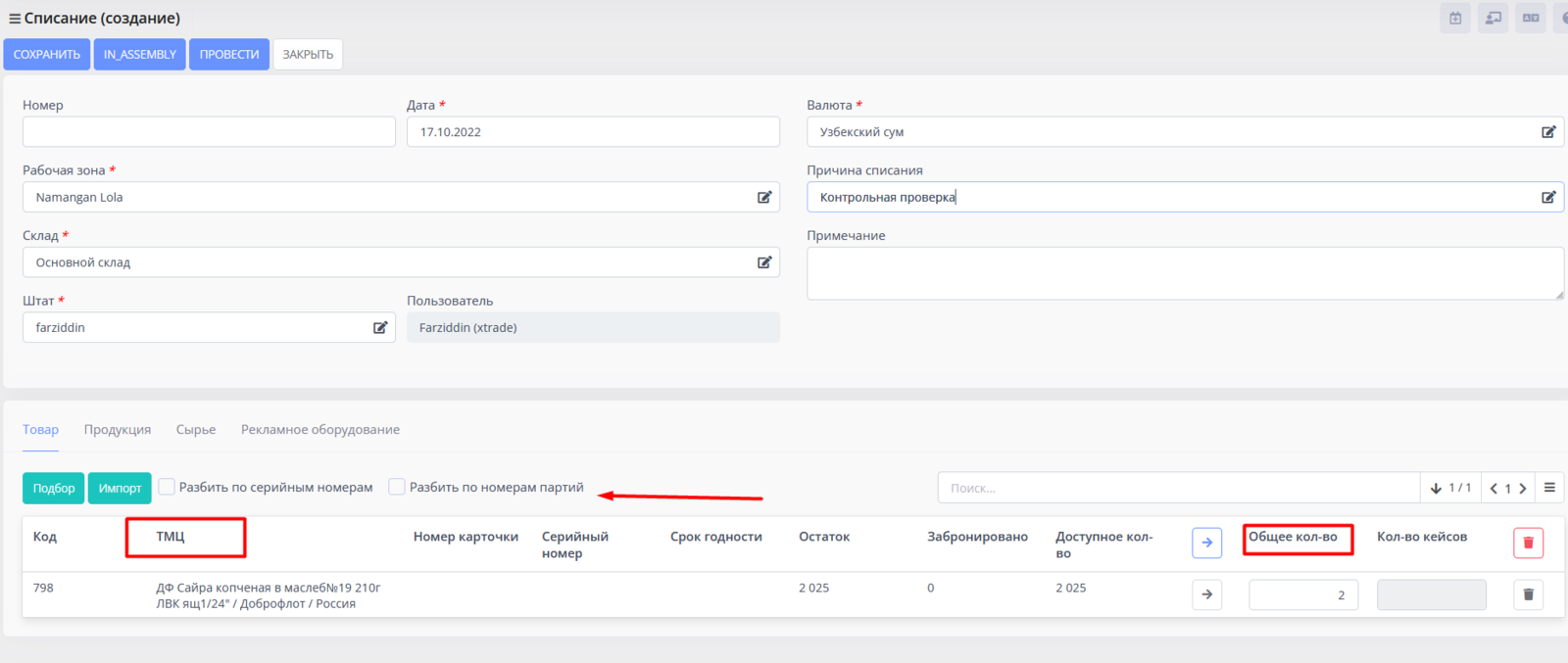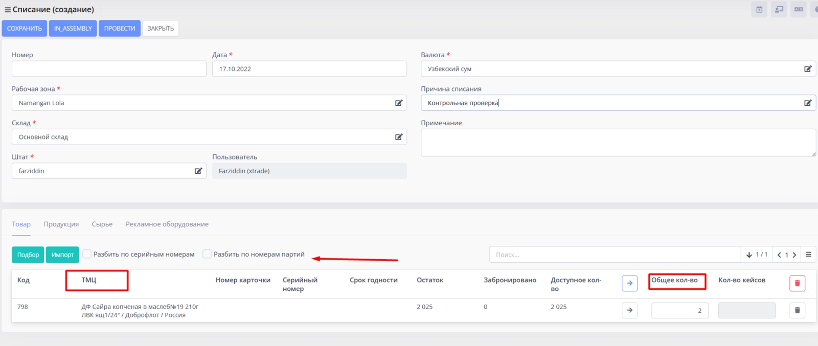 Обязательно необходимо указать Общее количество ТМЦ, которое вы списываете.