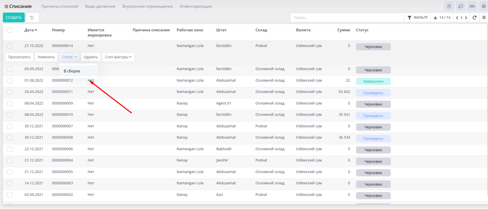 Также при создании документа вы можете воспользоваться кнопкой Сохранить: в этом случае документ сохранится в статусе Черновик и не будет доступен в мобильной версии. Изменить статус Черновик на статус В сборке можно непосредственно из списка документов, не переходя в сам документ.